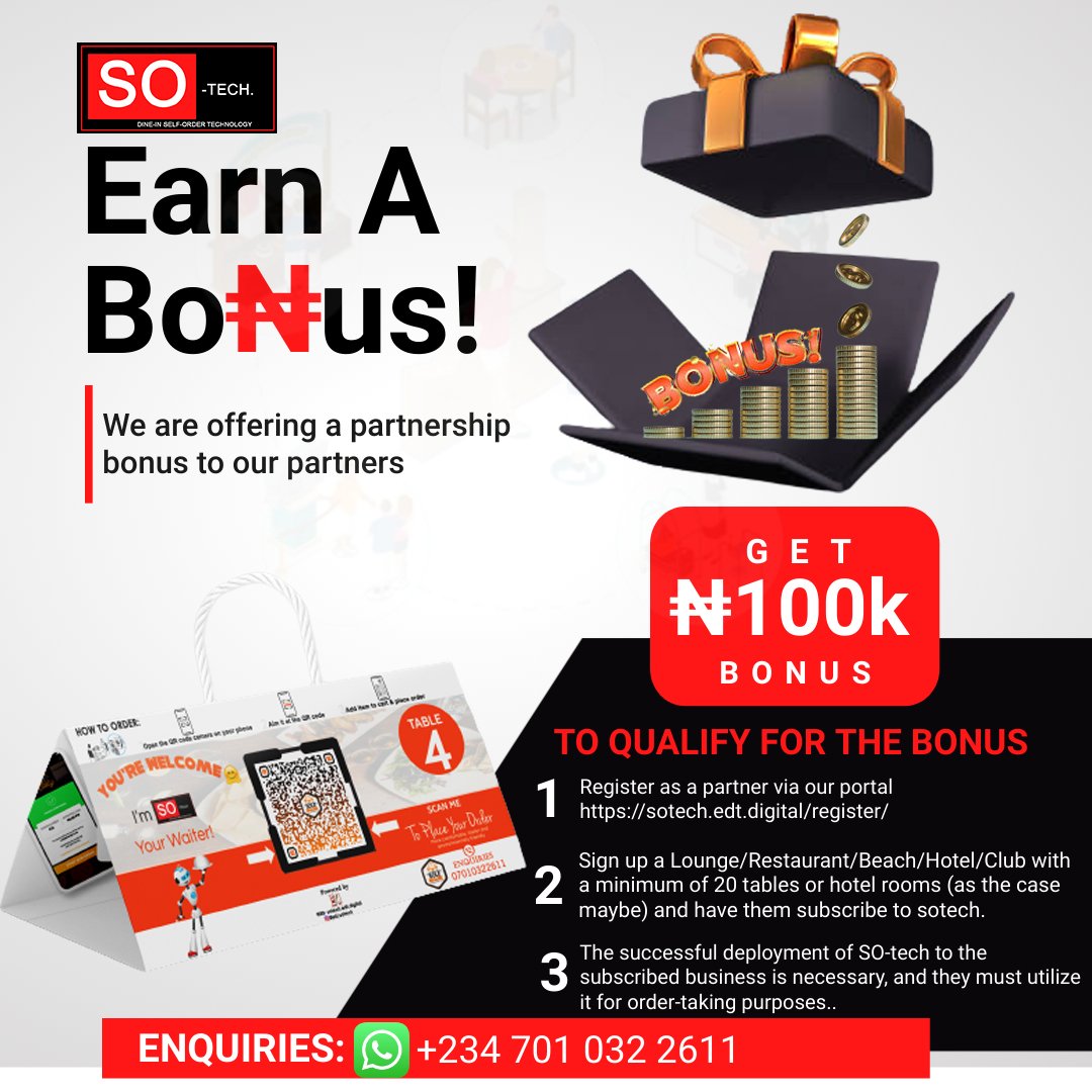 SOtech, as a leading online waiter platform, presents an incredible opportunity for you to engage with business owners, expand your reach, and create sustainable earnings for yourself. In this blog post, we’ll discuss the importance of fully engaging with business owners, leveraging bonuses, and maximizing the partnership commission offered by SOtech for every subscriber.